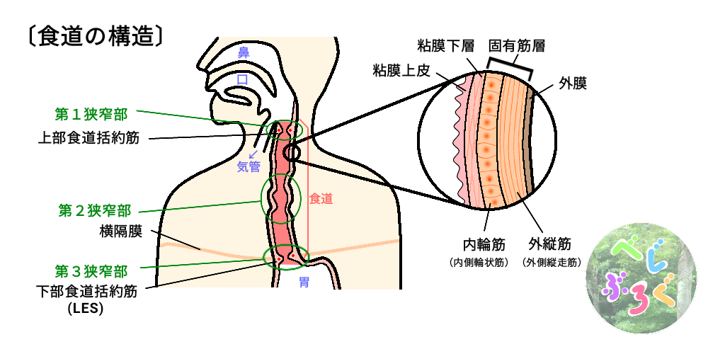 さらに、食道の入口には「上部食道括約筋」、出口には「下部食道括約筋」があります。