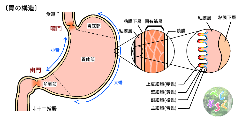 固有筋層:胃を動かすための筋肉(平滑筋)で出来ています。こちらは食道と同様、 内側に輪っか状の筋肉(輪状筋)、外側に上下に走る筋肉(縦走筋)があります。