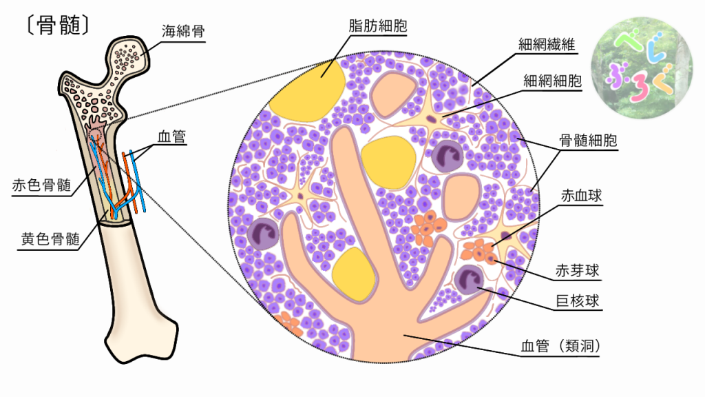 骨髄には、造血細胞を多く含み造血作用がある「赤色骨髄」と、脂肪細胞が多く含み、造血作用がない「黄色骨髄」があります。
