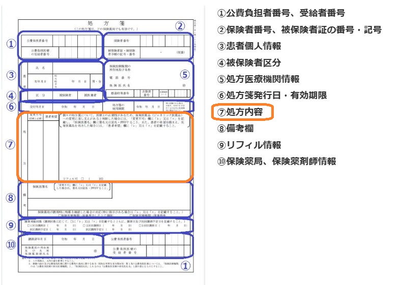 記載事項の概要と①公費負担者番号・受給者番号~➅処方せん発行日・有効期限については#0023(前回のコラム)、⑧備考欄以降については#0025(次のコラム)で解説していますので併せてご覧ください。