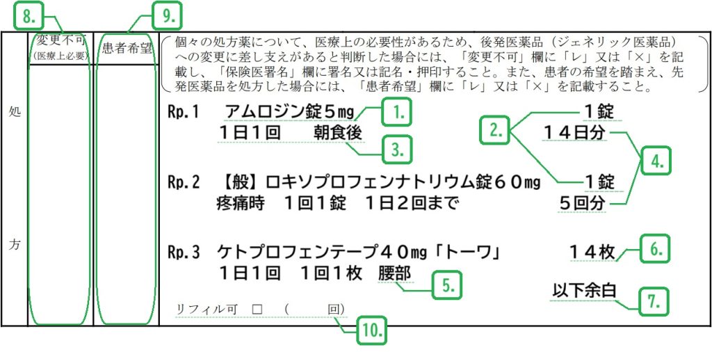 処方内容欄に記載される内容は具体的には以下の10項目となります。